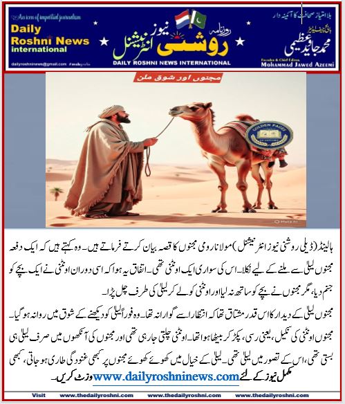 ہالینڈ(ڈیلی روشنی نیوز انٹرنیشنل )مولانا رومی مجنوں کا قصہ بیان کرتے فرماتے ہیں۔ وہ کہتے ہیں کہ ایک دفعہ مجنوں لیلیٰ سے ملنے کے لیے نکلا۔ اس کی سواری ایک اونٹنی تھی۔ اتفاق یہ ہوا کہ اسی دوران اونٹنی نے ایک بچے کو جنم دیا، مگر مجنوں نے بچے کو ساتھ نہ لیا اور اونٹنی کو لے کر لیلیٰ کی طرف چل پڑا۔