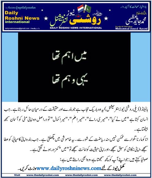 ہالینڈ(ڈیلی روشنی نیوز انٹرنیشنل )یہ وہ باریک حجاب ہے جو بندے اور حقیقت کے درمیان حائل رہتا ہے۔ جب انسان کہتا ہے “میں نے کیا”، “میری رائے”، “میرا علم”، “میرا کمال” تو دراصل وہ اپنی مٹی کو آسمان سمجھ بیٹھتا ہے۔