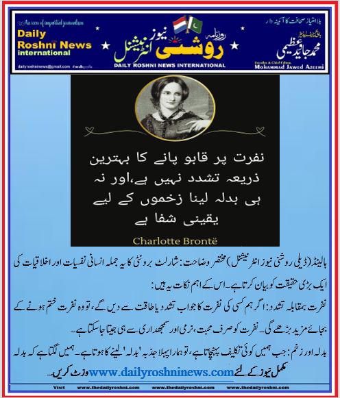 ہالینڈ(ڈیلی روشنی نیوز انٹرنیشنل)مختصر وضاحت:شارلٹ برونٹی کا یہ جملہ انسانی نفسیات اور اخلاقیات کی ایک بڑی حقیقت کو بیان کرتا ہے۔ اس کے اہم نکات یہ ہیں:
