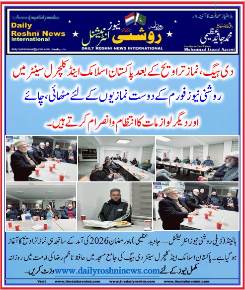 ہالینڈ(ڈیلی روشنی نیوز انٹرنیشنل۔۔ جاوید عظیمی )ماہ رمضان2026 کی آمد کے ساتھ ہی نماز تراویح کا آغاز ہو گیا ہے۔ پاکستان اسلامک اینڈ کلچرل سینٹر دی ہیگ کی جامع مسجد میں حافظ ناظم رضا کی امامت میں روزانہ کی بنیاد پر نماز تراویح ادا کی جارہی ہے۔ حافظ صاحب اپنی دلنشین آواز اور قرآنی الفاظ کی خوبصورت ادائیگی کے ساتھ اللہ تعالٰی کی آخری آفاقی مقدس کتاب قرآن مجید کی تلاوت کرنے میں مصروف عمل ہیں۔نماز تراویح میں نمازیوں کی تعداد میں روزانہ کی بنیاد پر اضافہ ہوتا چلا جا رہا ہے۔ نماز تراویح کے بعد روشنی نیوز فورم کے دوست نمازیوں کی تواضع مٹھائی ، چائے اور دیگر اشیاء خورد و نوش سے کرتے ہیں ۔ فرینڈز آف روشنی فورم کے متحرک اراکین میاں عاصم محمود اور میاں آفتاب انتظام و انصرام کرنے میں پیش پیش ہیں۔ نماز تراویح کے بعد نمازیوں کے ساتھ ساتھ فرینڈز آف روشنی فورم کی ٹیم بھی بھر پور شرکت کرتی ہے۔ متذکرہ صاحبان کے مطابق یہ سلسلہ روزانہ کی بنیاد پر ماہ رمضان کے اختتام تک جاری رہے گا۔