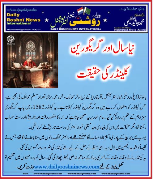 ہالینڈ(ڈیلی روشنی نیوز انٹرنیشنل )آج دنیا کے زیادہ تر ممالک، جن میں بڑی تعداد مسلم ممالک کی بھی ہے، جس کیلنڈر کو استعمال کر رہے ہیں وہ گریگورین کیلنڈر کہلاتا ہے۔ یہ کیلنڈر 1582ء میں پاپ گریگوری سیزدہم کے حکم پر رائج کیا گیا۔ عام طور پر یہ سمجھا جاتا ہے کہ اس کا مقصد وقت اور تاریخ کا درست حساب رکھنا تھا، مگر حقیقت میں اس کی بنیادی وجہ مسیحی تہوار ایسٹر کی درست تاریخ طے کرنا تھی۔