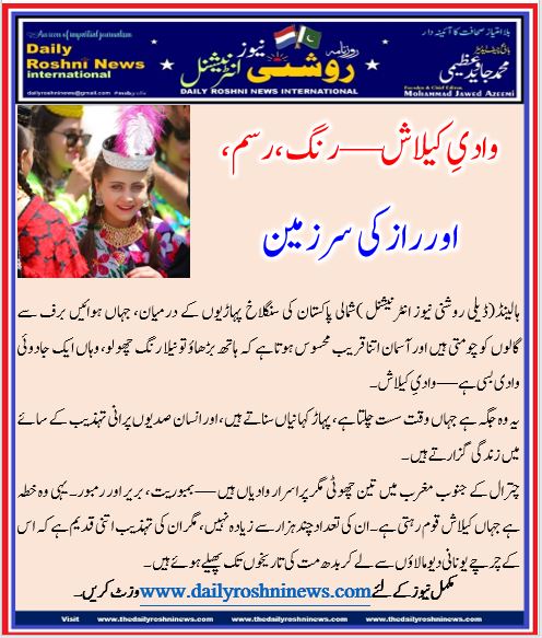 ہالینڈ(ڈیلی روشنی نیوز انٹرنیشنل )شمالی پاکستان کی سنگلاخ پہاڑیوں کے درمیان، جہاں ہوائیں برف سے گالوں کو چومتی ہیں اور آسمان اتنا قریب محسوس ہوتا ہے کہ ہاتھ بڑھاؤ تو نیلا رنگ چھو لو، وہاں ایک جادوئی وادی بسی ہے — وادیِ کیلاش۔