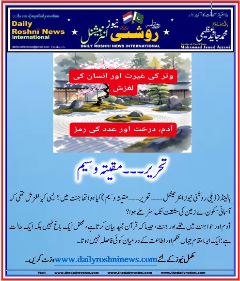 ہالینڈ(ڈیلی روشنی نیوز انٹرنیشنل ۔۔۔ تحریر۔۔۔مقیتہ وسیم )کیا ہوا تھا جنت میں؟ ایسی کیا لغزش تھی کہ آسمانی سکون سے زمین کی مشقت تک سفر طے ہوا؟