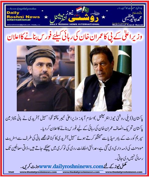 پاکستان(ڈیلی روشنی نیوز انٹرنیشنل )اسلام آباد: وزیراعلیٰ خیبر پختونخوا سہیل آفریدی نے بانی چیئرمین پاکستان تحریک انصاف عمران خان کی رہائی کے لیے فورس بنانے کا اعلان کر دیا۔