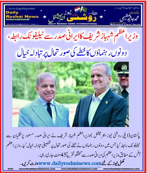 پاکستان(ڈیلی روشنی نیوز انٹرنیشنل )وزیراعظم شہباز شریف نے ایرانی صدر مسعود پزشکیان سے ٹیلیفونک رابطہ کیا جس میں دونوں رہنماؤں نے خطے کی صورتحال پرتفصیلی تبادلہ خیال کیا۔