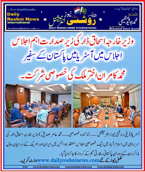 آسٹریا(ڈیلی روشنی نیوز انٹرنیشنل ۔۔۔نمائندہ خصوصی۔۔۔محمد عامر صدیق ) وزیر خارجہ اسحاق ڈار کی سربراہی میں اسلام آباد میں ایک خصوصی اجلاس منعقد ہوا جس میں ایران اور امریکہ کے درمیان حالیہ مذاکرات کے دوران پاکستانی سفارتی ٹیم کے کردار کا جائزہ لیا گیا۔