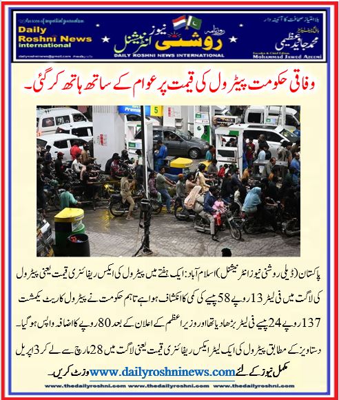 پاکستان (ڈیلی روشنی نیوز انٹرنیشنل )اسلام آباد: ایک ہفتے میں پیٹرول کی ایکس ریفائنری قیمت یعنی پیٹرول کی لاگت میں فی لیٹر 13 روپے 58 پیسے کی کمی کا انکشاف ہوا ہے تاہم حکومت نے پیٹرول کاریٹ یکمشت 137 روپے 24 پیسے فی لیٹر بڑھا دیا  تھا اور وزیراعظم کے اعلان کے بعد 80 روپے کا اضافہ واپس ہوگیا۔