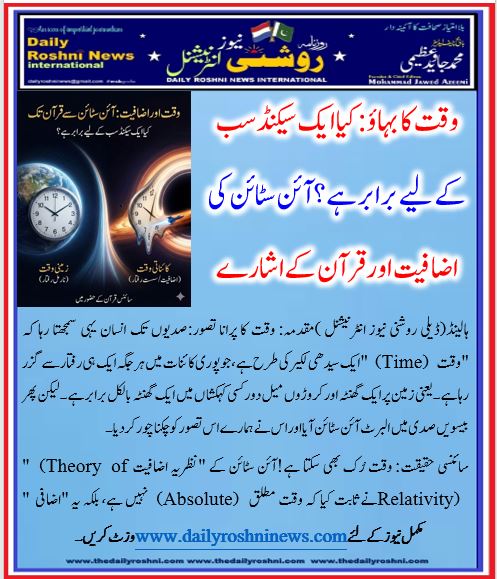ہالینڈ(ڈیلی روشنی نیوز انٹرنیشنل )مقدمہ: وقت کا پرانا تصور:صدیوں تک انسان یہی سمجھتا رہا کہ “وقت” (Time) ایک سیدھی لکیر کی طرح ہے، جو پوری کائنات میں ہر جگہ ایک ہی رفتار سے گزر رہا ہے۔ یعنی زمین پر ایک گھنٹہ اور کروڑوں میل دور کسی کہکشاں میں ایک گھنٹہ بالکل برابر ہے۔ لیکن پھر بیسویں صدی میں البرٹ آئن سٹائن آیا اور اس نے ہمارے اس تصور کو چکنا چور کر دیا۔
