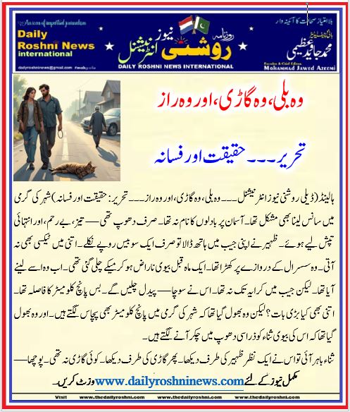گھر پہنچ کر ظہیر نے چائے بنائی۔ ثناء نے وہی پرانی سی کرسی پر بیٹھ کر پوچھا — “گاڑی میں کیا تھا؟” ظہیر نے چائے کا کپ اس کی طرف بڑھاتے ہوئے کہا — “ایک بچی۔ چھوٹی سی۔ میری بیٹی جیسی۔” ثناء کے ہاتھ سے کپ گر گیا۔ چائے فرش پر بکھر گئی۔ اس نے اپنا منہ دونوں ہاتھوں میں دبایا اور پھوٹ پھوٹ کر رونے لگی۔ یہ اس بیٹی کا روتھا ہوا غم تھا جو دو سال سے اس کے سینے میں دب کر پتھر بن چکا تھا۔ ظہیر نے اس کے قریب جا کر اس کا سر اپنے سینے سے لگا لیا۔ دونوں رو رہے تھے۔ کمرے میں صرف رونے کی آواز تھی اور چائے کی خوشبو جو فرش سے اٹھ رہی تھی۔