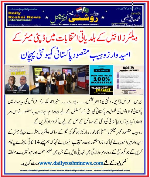 پیرس۔    فرانس(ڈیلی روشنی نیوز انٹرنیشنل ۔۔۔  رپورٹ۔۔۔ منیر احمد ملک)          فرانس کی سیاست میں پاکستانی نوجوانوں کی شمولیت پاکستانی کمیونٹی کے مسقبل کے لیے بہت اہم ہے زوہیب مقصود نے اس امر کا اعادہ کیا ہے کہ وہ پاکستانی کمیونٹی کے مسائل کے حل کے لیے اپنا کردار ادا کریں گے