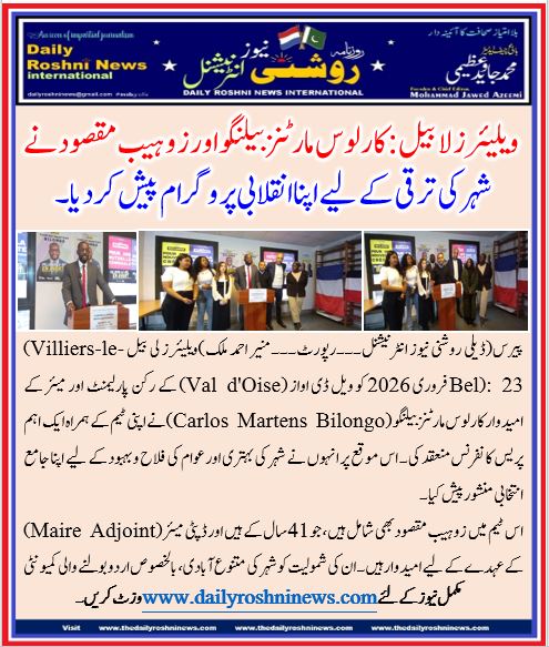 پیرس(ڈیلی روشنی نیوز انٹرنیشنل۔۔۔رپورٹ۔۔۔منیر احمد ملک)ویلیئرز لی بیل (Villiers-le-Bel): 23 فروری 2026 کو ویل ڈی اواز (Val d’Oise) کے رکن پارلیمنٹ اور میئر کے امیدوار کارلوس مارٹنز بیلنگو (Carlos Martens Bilongo) نے اپنی ٹیم کے ہمراہ ایک اہم پریس کانفرنس منعقد کی۔ اس موقع پر انہوں نے شہر کی بہتری اور عوام کی فلاح و بہبود کے لیے اپنا جامع انتخابی منشور پیش کیا۔