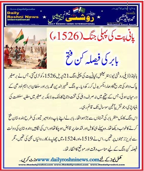 ہالینڈ(ڈیلی روشنی نیوز انٹرنیشنل)پانی پت کی پہلی جنگ 21 اپریل 1526ء کو لڑی گئی، جس نے برصغیر پاک و ہند کی تاریخ کا دھارا یکسر بدل کر رکھ دیا۔ یہ جنگ ظہیر الدین محمد بابر اور سلطان ابراہیم لودھی کے درمیان ہوئی، جس کے نتیجے میں نہ صرف دہلی کی تخت و تاج کا مالک بدلا بلکہ برصغیر میں مغلیہ سلطنت کی بنیاد پڑی، جو تقریباً تین سو سال تک قائم رہی۔