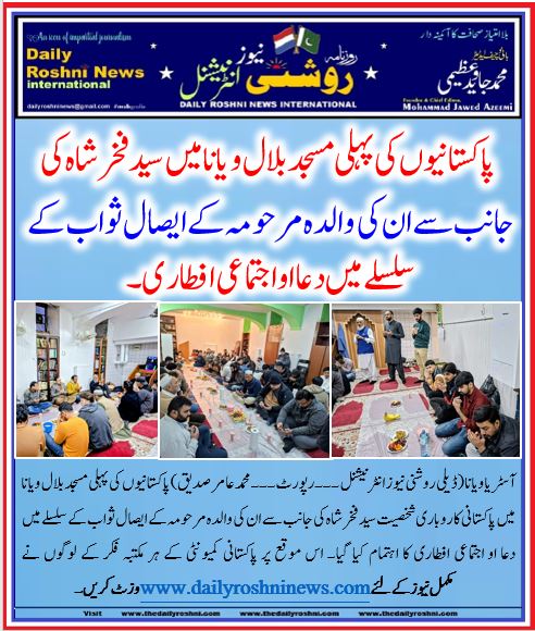 آسٹریا ویانا (ڈیلی روشنی نیوز انٹرنیشنل ۔۔۔رپورٹ۔۔۔محمد عامر صدیق) پاکستانیوں کی پہلی مسجد بلال ویانا میں پاکستانی کاروباری شخصیت سید فخر شاہ کی جانب سے ان کی والدہ مرحومہ کے ایصال ثواب کے سلسلے میں دعا او اجتماعی افطاری کا اہتمام کیا گیا۔ اس موقع پر پاکستانی کمیونٹی کے ہر مکتبہ فکر کے لوگوں نے بالخصوص،مذہبی، کاروباری، اسٹوڈنٹس نے بھرپور شرکت کی۔