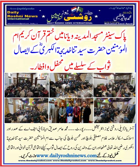 آسٹریا (ڈیلی روشنی نیوز انٹرنیشنل۔۔۔رپورٹ ۔۔۔محمد عامر صدیق ویانا) پی ایف اے کے صدر اور اسلامک اسکالر علامہ غلام مصطفیٰ بلوچ اور محسن بلوچ کی جانب سے ام المؤمنین حضرت سيدتنا خديجة الكبرى رضى الله تعالى عنها اور ان کے والدین کی روح کے ایصال ثواب کیلئے اجتماعی قرآن خوانی اور اجتماعی فاتحہ خوانی کا اہتمام پاک سینٹر مسجد المدینہ 21 ڈسٹرکٹ میں کیا گیا ۔جس میں اسلامی نظریاتی کونسل آسٹریا کے سابق صدور، ترکی،عربی اور پاکستانی کمیونٹی کی مختلف تنظیموں سیاسی ومذہبی و سماجی شخصیات،اسٹریا بھر کے مختلف شہروں سالزبرگ سے پاکستانی کاروباری شخصیت چودری غلام مصطفی گجر، چوہدری اظہر ورک اور پاکستانی کمیونٹی نے بھرپور شرکت کرکے قرآن خوانی اور زکر نعت کی محفل میں شرکت کی۔ قرآن خوانی کے بعد زکر نعت محفل کا آغاز علامہ حافظ دلاور کی تلاوت قرآن پاک سے کیا گیا ۔گلہائے عقیدت کے پھول یورپ کے معروف نعت خواں غلام مصطفی نعیمی نے پیش کئے۔