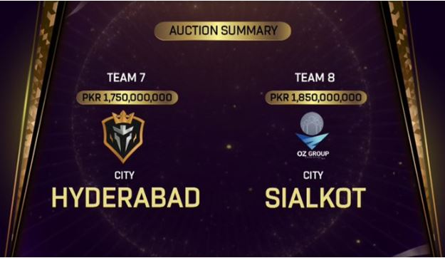 پاکستان سپر لیگ(پی ایس ایل) میں 2 نئی ٹیمیں حیدرآباد اور سیالکوٹ شامل ہوگئیں، ایف کے ایس گروپ نے ٹیم 175 کروڑ روپے جبکہ اوزی ڈیولپرز نے ٹیم 185 کروڑ روپے میں خرید لی۔