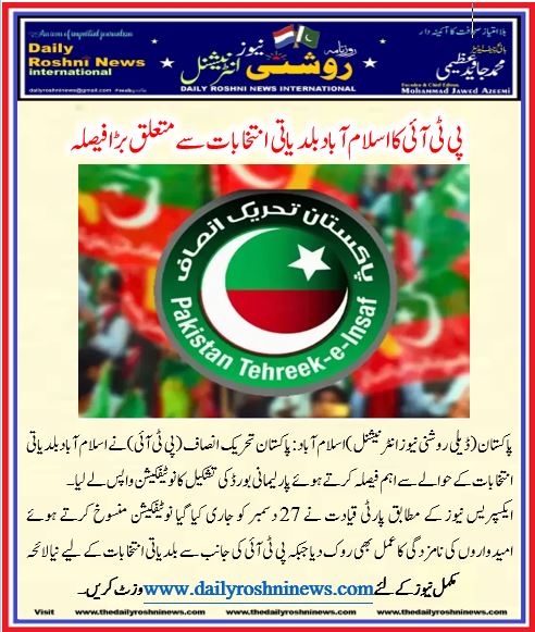 پاکستان(ڈیلی روشنی نیوز انٹرنیشنل )اسلام آباد:پاکستان تحریک انصاف (پی ٹی آئی) نے اسلام آباد بلدیاتی انتخابات کے حوالے سے اہم فیصلہ کرتے ہوئے پارلیمانی بورڈ کی تشکیل کا نوٹیفکیشن واپس لے لیا۔