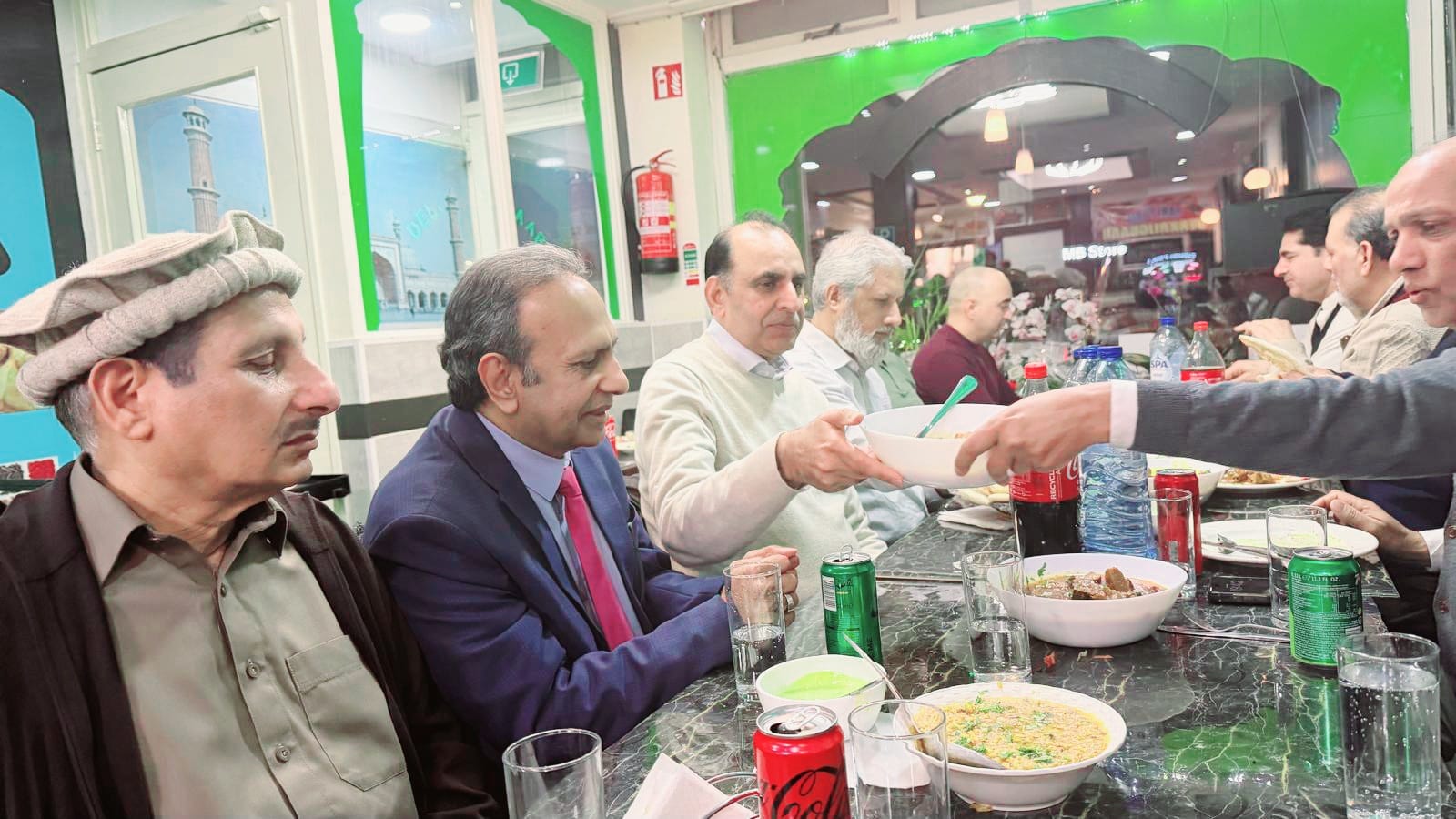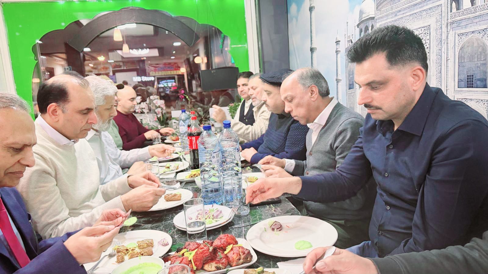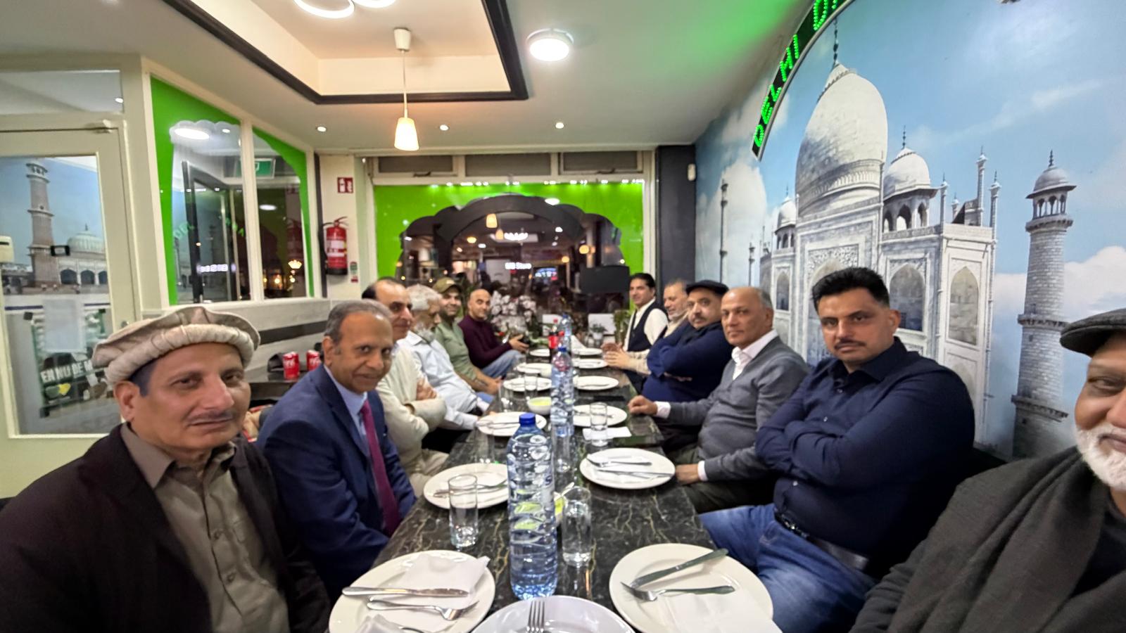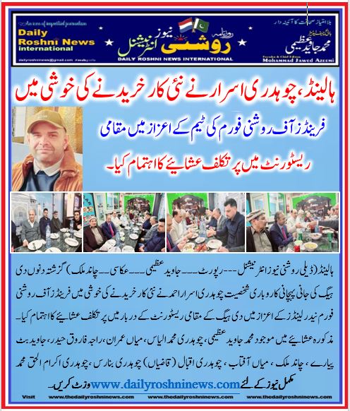 ہالینڈ(ڈیلی روشنی نیوز انٹرنیشنل — رپورٹ۔۔۔ جاوید عظیمی ۔۔۔عکاسی ۔۔چاند ملک ) گزشتہ دنوں دی ہیگ کی جانی پہچانی کاروباری شخصیت چوہدری اسرار احمد نے نئی کار خریدنے کی خوشی میں فرینڈز آف روشنی فورم نیدر لینڈز کے اعزاز میں دی ہیگ کے مقامی ریسٹورنٹ کے دربار میں پر تکلف عشائیے کا اہتمام کیا ۔ مذکورہ عشائیے میں موجود محمد جاوید عظیمی، چوہدری محمد الیاس ، میاں عمران ،راجہ فاروق حیدر، جاوید بٹ پیارے ، چاند ملک ، میاں آفتاب ، چوہدری اقبال (قاضیاں) چوہدری بنارس ،چوہدری اکرام الحق محمد کامران اور حاجی چوہدری محمد نواز نے چوہدری اسرار احمد کو نئی کار خریدنے کی خوشی میں صمیم قلب سے مبارکباد اور دعائیہ کلمات ادا کیئے اجتماعی دعا میں محمد جاوید عظیمی نے میزبان اول