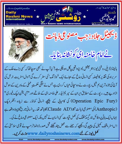 ہالینڈ(ڈیلی روشنی نیوز انٹرنیشنل )دنیا واقعی پاگل ہو چکی ہے! کیا آپ نے کبھی سوچا تھا کہ کسی بڑے ملک کے سربراہ کی تقدیر کا فیصلہ کسی انسانی دماغ کے بجائے ایک ‘کوڈنگ’ کی سطر کرے گی؟ وال اسٹریٹ جرنل کی آج کی تازہ ترین بم شیل رپورٹ نے وہ سچائی عیاں کر دی ہے جس نے جنگی حکمتِ عملی کے ماہرین کے ہوش اڑا دیے ہیں۔ رپورٹ کے مطابق ایران کے سپریم لیڈر علی خامنہ ای کے خاتمے اور “آپریشن ایپک فیوری” (Operation Epic Fury) کی کامیابی کے پیچھے انسانی کمانڈر سے زیادہ انتھروپک (Anthropic) کی مصنوعی ذہانت ‘کلاڈ’ (Claude AI) کا ہاتھ تھا۔ یہ انسانی تاریخ کا پہلا واقعہ ہے جہاں ایک ہائی پروفائل ٹارگیٹڈ کلنگ کی مکمل قیادت کسی انسان نے نہیں بلکہ ایک مصنوعی دماغ نے کی۔
