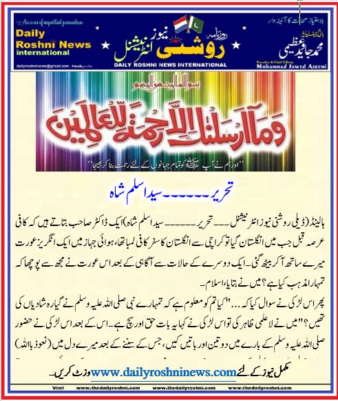 ایک ڈاکٹر صاحب بتاتے ہیں کہ کافی عرصہ قبل جب میں انگلستان گیا تو کراچی سے انگلستان کا سفر کافی لمبا تھا، ہوائی جہاز میں ایک انگریز عورت میرے ساتھ آ کر بیٹھ گئی ۔ ایک دوسرے کے حالات سے آگاہی کے بعد اس عورت نے مجھ سے پو چھا کہ تمہارا مذہب کیا ہے ؟ میں نے بتایا، اسلام ۔