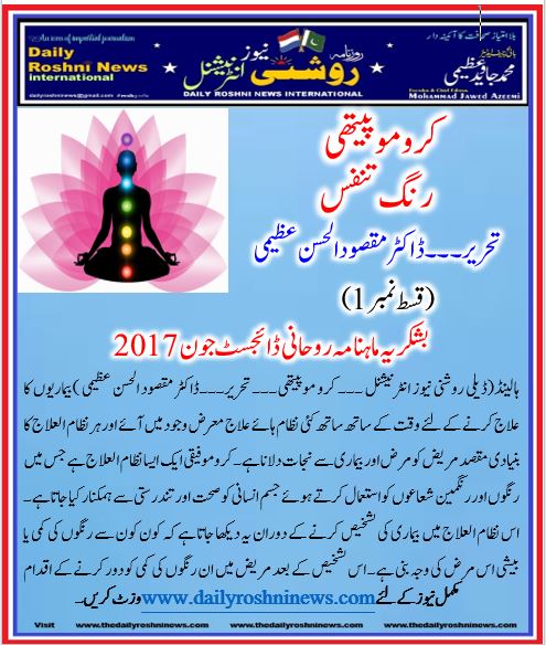ہالینڈ(ڈیلی روشنی نیوز انٹرنیشنل ۔۔۔ کرو موپیتھی۔۔۔ تحریر۔۔۔ڈاکٹر مقصود الحسن عظیمی )بیماریوں کا علاج کرنے کے لئے وقت کے ساتھ ساتھ کئی نظام ہائے علاج معرض وجود میں آئے اور ہر نظام العلاج کا بنیادی مقصد مریض کو مرض اور بیماری سے نجات دلانا ہے۔ کروموفیقی ایک ایسا نظام العلاج ہے جس میں رنگوں اور رنگمین شعاعوں کو استعمال کرتے ہوئے جسم انسانی کو صحت اور تندرستی سے ہمکنار کیا جاتا ہے۔ اس نظام العلاج میں بیماری کی تشخیص کرنے کے دوران یہ دیکھا جاتا ہے کہ کون کون سے رنگوں کی کمی یا بیشی اس مرض کی وجہ بنی ہے۔ اس تشخیص کے بعد مریض میں ان رنگوں کی کمی کو دور کرنے کے اقدام کئے جاتے ہیں جو اُس کی بیماری کا سبب بن رہے ہوں یا ان رنگوں کا جو اس میں زیادہ ہو چکے ہوں اُن کا اثر زائل کرنے والے رنگ تجویز کئے جاتے ہیں۔