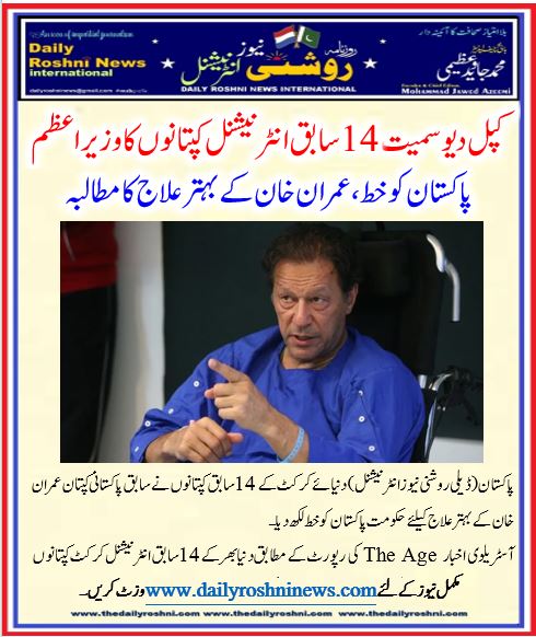 آسٹریلوی اخبار The Age کی رپورٹ کے مطابق دنیا بھر کے 14 سابق انٹرنیشنل کرکٹ کپتانوں نے پاکستان کے وزیرِاعظم شہباز شریف کو ایک خط لکھ کر سابق کپتان عمران خان کی صحت پر گہری تشویش کا اظہار کیا ہے ۔