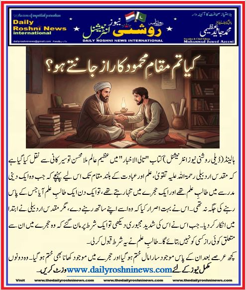 ہالینڈ(ڈیلی روشنی نیوز انٹرنیشنل )کتاب “تالی الاخبار” میں عظیم عالم ملا محسن توسیرکانی سے نقل کیا گیا ہے کہ مقدس اردبیلی رحمۃ اللہ علیہ تقویٰ، علم اور عبادت کے بلند مقام تک اس لیے پہنچے کہ جب وہ ایک دینی مدرسے میں طالبِ علم تھے اور ایک حجرے میں تنہا رہتے تھے، تو ایک دن ایک طالبِ علم آیا جس کے پاس رہنے کی جگہ نہ تھی۔ اس نے بہت اصرار کیا کہ وہ اسے اپنے ساتھ رہنے دے، مگر مقدس اردبیلی نے ابتدا میں انکار کر دیا۔ جب اس نے اس کی شدید مجبوری دیکھی تو ایک شرط پر مان گئے کہ وہ حجرے میں ان سے متعلق کوئی راز کسی کو نہیں بتائے گا۔ طالبِ علم نے یہ شرط قبول کر لی۔