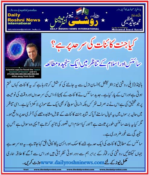 ہالینڈ(ڈیلی روشنی نیوز انٹرنیشنل) انسان ازل سے یہ جاننے کی کوشش کرتا رہا ہے کہ یہ کائنات کہاں ختم ہوتی ہے اور اس کے پار کیا ہے۔ جدید سائنس نے کائنات کے پھیلاؤ، اس کی سرحدوں اور وقت کی نوعیت پر جو تحقیق کی ہے اس نے نہ صرف فزکس بلکہ انسانی سوچ کو بھی ایک نئے موڑ پر لا کھڑا کیا ہے۔ اسی تناظر میں حالیہ برسوں میں یہ خیال سامنے آیا کہ شاید جنت کائنات کے قابلِ مشاہدہ حصے کی آخری حد پر واقع ہو۔ مگر کیا یہ بات سائنسی طور پر ثابت ہے؟ اور کیا اسلام اس تصور کی تائید کرتا ہے؟ یہی وہ سوال ہے جس پر سنجیدگی سے غور ضروری ہے۔