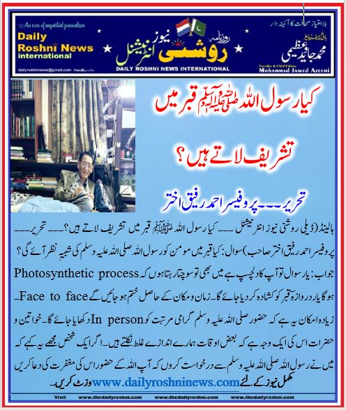 ہالینڈ(ڈیلی روشنی نیوز انٹرنیشنل ۔۔۔ کیا رسول اللہ صلی اللہ علیہ وآلہ وسلم قبر میں تشریف لاتے ہیں؟۔۔۔ تحریر۔۔۔ پروفیسر احمد رفیق اختر صاحب)سوال: کیا قبر میں مومن کو رسول اللہ صلی اللہ علیہ وسلم کی شبیہٖ نظر آئے گی؟