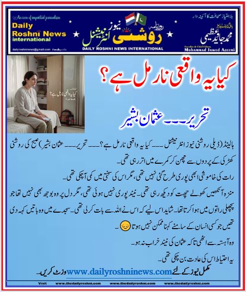 ہالینڈ(ڈیلی روشنی نیوز انٹرنیشنل ۔۔۔ کیا یہ واقعی نارمل ہے؟۔۔۔ تحریر۔۔۔ عثمان بشیر)صبح کی روشنی کھڑکی کے پردوں سے چھن کر کمرے میں اتر رہی تھی۔