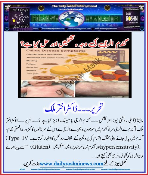 ہالینڈ(ڈیلی روشنی نیوز انٹرنیشنل ۔۔۔ گندم الرجی یا سیلیک ڈزیز کیا ہے ؟۔۔۔تحریر۔۔۔ڈاکٹراختر ملک)گندم سے الرجی مراد گندم میں موجود پروٹین سے الرجی ہے اس کے مریضوں کا کمزور مدافعتی نظام، گندم میں پائی جانے والی مختلف اقسام کی پروٹین کے خلاف ردعمل کا اظہار کرتا ہے۔(Type IV hypersensitivity). اور گندم میں موجود پروٹین ’’گلوٹین‘‘ (Gluten) سے پیدا ہونے والی الرجی کو گلوٹن الرجی بھی کہتے ہیں۔
