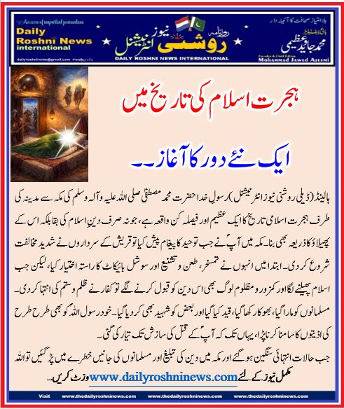 ہالینڈ(ڈیلی روشنی نیوز انٹرنیشنل )رسولِ خدا حضرت محمد مصطفیٰ صلی اللہ علیہ وآلہ وسلم کی مکہ سے مدینہ کی طرف ہجرت اسلامی تاریخ کا ایک عظیم اور فیصلہ کن واقعہ ہے، جو نہ صرف دینِ اسلام کی بقا بلکہ اس کے پھیلاؤ کا ذریعہ بھی بنا۔ مکہ میں آپؐ نے جب توحید کا پیغام پیش کیا تو قریش کے سرداروں نے شدید مخالفت شروع کر دی۔ ابتدا میں انہوں نے تمسخر، طعن و تشنیع اور سوشل بائیکاٹ کا راستہ اختیار کیا، لیکن جب اسلام پھیلنے لگا اور کمزور و مظلوم لوگ بھی اس دین کو قبول کرنے لگے تو کفار نے ظلم و ستم کی انتہا کر دی۔ مسلمانوں کو مارا گیا، بھوکا رکھا گیا، قید کیا گیا اور بعض کو شہید بھی کر دیا گیا۔ خود رسول اللہؐ کو بھی طرح طرح کی اذیتوں کا سامنا کرنا پڑا، یہاں تک کہ آپؐ کے قتل کی سازش تک تیار کی گئی۔