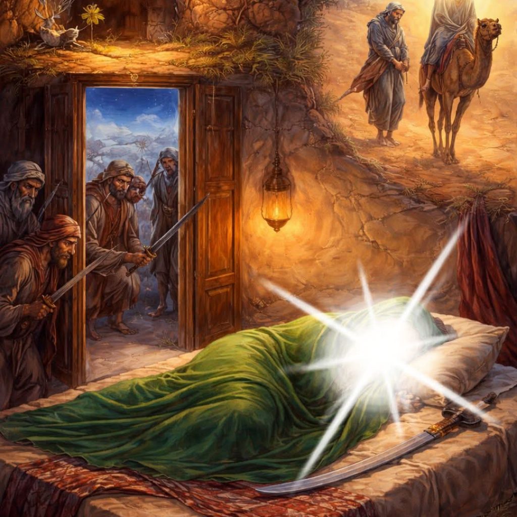 اسی موقع پر رسول اللہؐ نے حضرت علی علیہ السلام کو اپنے بستر پر سونے کا حکم دیا تاکہ دشمنوں کو یہ گمان رہے کہ آپؐ ابھی اپنے گھر میں موجود ہیں۔ حضرت علیؑ نے بغیر کسی ہچکچاہٹ کے اس عظیم خطرے کو قبول کیا، حالانکہ انہیں معلوم تھا کہ کفار رات کے وقت حملہ کر سکتے ہیں اور جان کا شدید خطرہ ہے۔ یہ ایثار اور فداکاری تاریخ میں بے مثال ہے کہ ایک جوان اپنی جان کو رسولِ خداؐ کے لیے خطرے میں ڈال دے۔