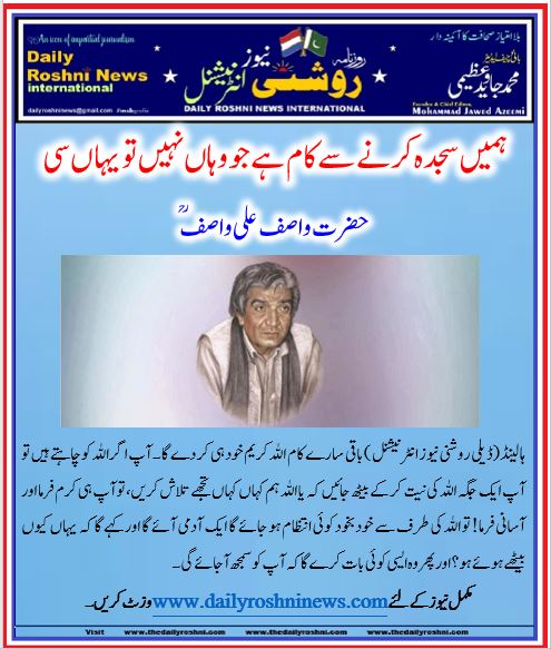 ہالینڈ(ڈیلی روشنی نیوز انٹرنیشنل )باقی سارے کام اللہ کریم خود ہی کر دے گا۔ آپ اگر اللہ کو چاہتے ہیں تو آپ ایک جگہ اللہ کی نیت کر کے بیٹھ جائیں کہ یا اللہ ہم کہاں کہاں تجھے تلاش کریں، تو آپ ہی کرم فرما اور آسانی فرما! تو اللہ کی طرف سے خود بخود کوئی انتظام ہو جائے گا ایک آدمی آئے گا اور کہے گا کہ یہاں کیوں بیٹھے ہوئے ہو؟ اور پھر وہ ایسی کوئی بات کرے گا کہ آپ کو سمجھ آجائے گی۔