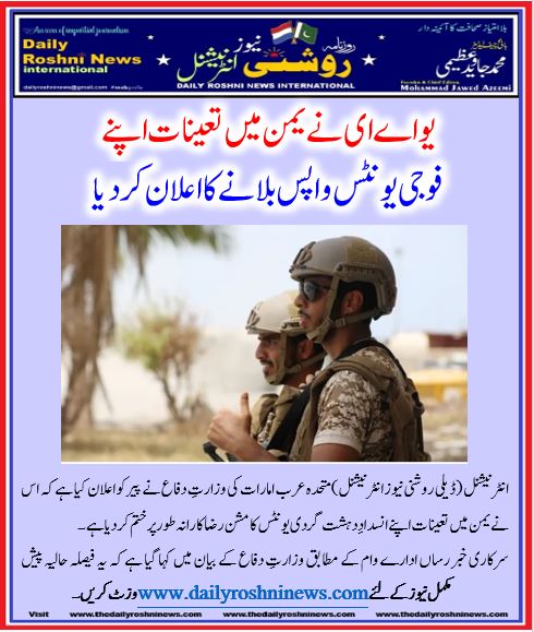 انٹرنیشنل (ڈیلی روشنی نیوز انٹرنیشنل)متحدہ عرب امارات کی وزارتِ دفاع نے پیر کو اعلان کیا ہے کہ اس نے یمن میں تعینات اپنے انسدادِ دہشت گردی یونٹس کا مشن رضاکارانہ طور پر ختم کر دیا ہے۔