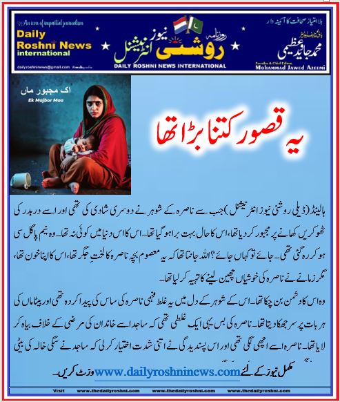 ہالینڈ(ڈیلی روشنی نیوز انٹرنیشنل )جب سے ناصرہ کے شوہر نے دوسری شادی کی تھی اور اسے دربدر کی ٹھوکریں کھانے پر مجبور کر دیا تھا، اس کا حال بہت برا ہو گیا تھا۔ اس کا اس دنیا میں کوئی نہ تھا۔ وہ نیم پاگل سی ہو کر رہ گئی تھی۔ جائے تو کہاں جائے؟ اللہ جانتا تھا کہ یہ معصوم بچہ ناصرہ کا لختِ جگر تھا، اس کا اپنا خون تھا، مگر زمانے نے ناصرہ کی خوشیاں چھین لینے کا تہیہ کر لیا تھا۔