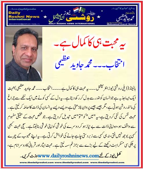 ہالینڈ(ڈیلی روشنی نیوز انٹرنیشنل ۔۔۔ یہ محبت ہی کا کمال ہے ۔۔۔۔ انتخاب ۔۔۔ محمد جاوید عظیمی)محبت ایک ایسا جذبہ ہے جو انسان کو اندر سے بدل کر رکھ دیتا ہے۔ یہ دل کے کسی کونے میں ایک ننھے سے چراغ کی مانند روشن ہوتی ہے، مگر جیسے جیسے پروان چڑھتی ہے، ویسے ویسے یہ انسان کی ذات کا احاطہ کر لیتی ہے۔ محبت نفس کی نفی کر دیتی ہے، یہ “میں” کو “تو” میں تبدیل کر دیتی ہے۔ جو شخص محبت کے حقیقی مفہوم سے واقف ہو، وہ اپنی ذات سے بے نیاز ہو کر دوسرے کی خوشی کو اپنی خوشی بنا لیتا ہے۔ سچی محبت کبھی کسی پر بوجھ نہیں بنتی، نہ ہی کسی سے زبردستی چاہے جانے کی خواہش کرتی ہے۔ یہ اپنے محبوب کے چہرے پر ہلکی سی مسکراہٹ دیکھنے کے لیے بڑے سے بڑا زخم سہہ لیتی ہے۔ محبت ایثار اور قربانی کا دوسرا نام ہے، یہ صرف لینا نہیں، بلکہ ہر چیز نچھاور کرنے کا نام ہے۔ جو شخص سچے دل سے کسی سے محبت کرتا ہے، وہ اپنے جذبات کو محبوب پر مسلط کرنے کے بجائے اس کی مرضی کو اپنی محبت پر ترجیح دیتا ہے۔