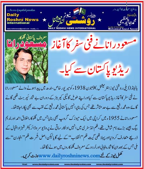 ہالینڈ(ڈیلی روشنی نیوز انٹرنیشنل )9جون 1938ء کومیرپور خاص سندھ میں پیدا ہونے والے مسعود رانا نے فنی سفرکاآغاز ریڈیوپاکستان سے کیااوراپنے طویل گائیکی کیریئر کے دوران بے شمار سُپرہٹ فلمی گانے گائے،وہ محمدرفیع سے بے حدمتاثرتھے جس کی بناپرانہیں پاکستانی محمد رفیع کے لقب سے بھی پکاراجاتا تھا۔
