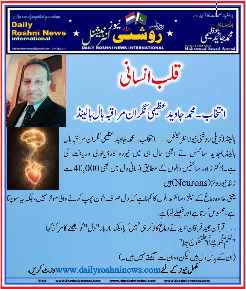 ہالینڈ(ڈیلی روشنی نیوزانٹرنیشنل )جدید سائنس نے ابھی حال ہی میں نیورو کارڈیالوجی دریافت کی ہے۔ڈاکٹرز اور سائینس دانوں کے مطابق انسانی دل میں بھی 40,000 سے زائد نیورونز (Neurons) ہیں
