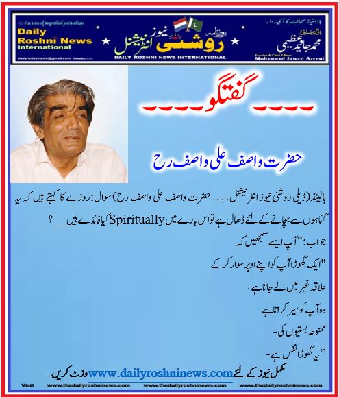 ہالینڈ(ڈیلی روشنی نیوز انٹرنیشنل ۔۔۔ حضرت واصف علی واصف رح) سوال:روزے کا کہتے ہیں کہ یہ گناہوں سے بچانے کے لئے ڈھال ہے تو اس بارے میں Spiritually کیا فائدے ہیں __؟
