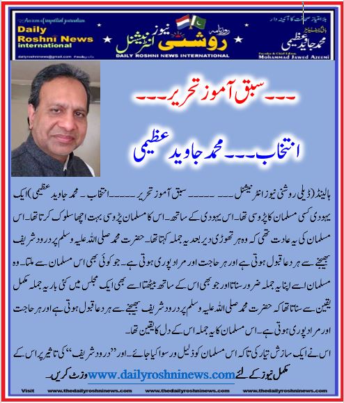 ہالینڈ(ڈیلی روشنی نیوز انٹرنیشنل ۔۔۔ ۔۔۔۔۔ سبق آموز تحریر ۔۔۔۔۔انتخاب ۔ محمد جاوید عظیمی)ایک یہودی کسی مسلمان کا پڑوسی تھا۔ اس یہودی کے ساتھ۔ اس کا مسلمان پڑوسی بہت اچھا سلوک کرتا تھا۔ اس مسلمان کی یہ عادت تھی کہ وہ ہر تھوڑی دیر بعد یہ جملہ کہتاتھا۔ حضرت محمد صلی اللہ علیہ وسلم پر درود شریف بھیجنے سے ہر دعا قبول ہوتی ہے اور ہر حاجت اور مراد پوری ہوتی ہے۔ جو کوئی بھی اس مسلمان سے ملتا۔ وہ مسلمان اسے اپنا یہ جملہ ضرور سناتا اور جو بھی اس کے ساتھ بیٹھتا اسے بھی ایک مجلس میں کئی بار یہ جملہ مکمل یقین سے سناتا تھا کہ حضرت محمد صلی اللہ علیہ وسلم پر درود شریف بھیجنے سے ہر دعا قبول ہوتی ہے اور ہر حاجت اور مراد پوری ہوتی ہے۔ اس مسلمان کا یہ جملہ اس کے دل کا یقین تھا۔
