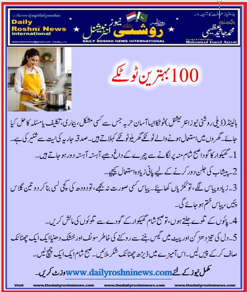 ہالینڈ(ڈیلی روشنی نیوز انٹرنیشنل )ٹوٹکا ایسا آسان حربہ جس سے کسی مشکل، بیماری، تکلیف یا مسئلہ کا حل کیا جائے۔ گھروں میں استعمال ہونے والے ٹوٹکے گھریلو ٹوٹکے کہلاتے ہیں۔ صدقہ جاریہ کی نیت سے شئیر کی ہے ۔