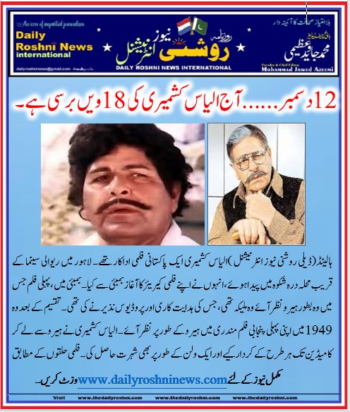 ہالینڈ(ڈیلی روشنی نیوز انٹرنیشنل )الیاس کشمیری ایک پاکستانی فلمی اداکار تھے۔ لاہور میں ریوالی سینما کے قریب محلہ درہ شکوہ میں پیدا ہوئے، انہوں نے اپنے فلمی کیریئر کا آغاز بمبئی سے کیا۔ بمبئی میں، پہلی فلم جس میں وہ بطور ہیرو نظر آئے وہ ملیکہ تھی، جس کی ہدایت کاری اور پروڈیوس نذیر نے کی تھی۔ تقسیم کے بعد وہ 1949 میں اپنی پہلی پنجابی فلم مندری میں ہیرو کے طور پر نظر آئے۔ الیاس کشمیری نے ہیرو سے لے کر کامیڈین تک ہر طرح کے کردار کیے اور ایک ولن کے طور پر بھی شہرت حاصل کی۔ فلمی حلقوں کے مطابق انہوں نے 600 سے زائد اردو اور پنجابی فلموں میں اداکاری کی۔ جن میں مکھڑا چن ورگا، چاچا جی، ہتھ جوڑی، بشیرا، سلطان ، بنارسی ٹھگ، استاد شاگرد ، عشق پر زور نہیں، پنجرا، حاتم، ماہی منڈا، صابرہ، یکے والی، لیلیٰ مجنوں وعدہ، انجام، شہرت، سردار اور مراد شامل ہیں۔