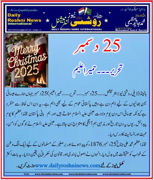 25 دسمبر جہاں ہمارے عیسائی بہن بھائیوں کے لیے اہم دن ہے وہیں پاکستانی عوام کے لیے بھی اہم ہے۔یہ دن اس لحاظ سے منفرد ہےکیونکہ عیسائی اس دن یوم ولادت عیسٰی علیہ السلام مناتے ہیں اور ہم بانی پاکستان قائداعظم کا یوم پیدائش۔یوں یہ دن تاریخ اور مذہبی ہم آہنگی کا امتزاج بن جاتا ہے۔عیسٰی علیہ السلام نے لوگوں کو امن، محبت اور انسانیت کا درس دیا ۔