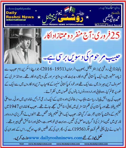 ہالینڈ(ڈیلی روشنی نیوز انٹرنیشنل )حبیب الرحمان (1931 – 2016)، جو اپنے اسکرین نام حبیب سے زیادہ مشہور ہیں، ایک پاکستانی فلمی اداکار، ہدایت کار، پروڈیوسر اور ٹیلی ویژن اداکار تھے۔ وہ انڈسٹری کے مصروف ترین ہیروز میں سے ایک تھے اور خود کو پاکستانی سنیما کے کامیاب ترین اداکاروں میں سے ایک کے طور پر قائم کیا۔ وہ پنجابی اور اردو دونوں زبانوں کی فلموں میں نظر آئے۔