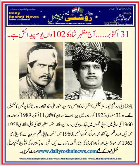 ہالینڈ(ڈیلی روشنی نیوز انٹرنیشنل )مظہر شاہ کا اصل نام سید منور علی شاہ تھا اور وہ ریٹائرڈ پولیس کانسٹیبل تھے۔ وہ 31 جنوری 1923 کو لاہور میں پیدا ہوئے اور ان کا انتقال 11 اکتوبر 1989 کو ہوا۔ وہ 1960 کی دہائی میں پنجابی فلموں میں ایک ہیوی ویٹ ولن اداکار تھے۔ مظہر شاہ کی پہلی اداکاری 1958 میں ایک اردو فلم بے گناہ میں ہوئی، لیکن انہیں 1960 میں مشہور پنجابی فلم بہروپیا سے کامیابی ملی۔ 1963 میں موج میلہ ان کی اداکاری کی بڑی فلموں میں سے ایک تھی۔ وہ پاکستان کی پہلی پلاٹینم جوبلی فلم جیدار میں مرکزی ولن تھے۔ چوڑیاں، ہتھ جوڑی، ملنگی (1965) اور جگری یار (1967) اکمل کے ساتھ ، ڈاچی، فرنگی، پگڑی سنبھال جٹا اور ماں پتر (1970) سدھیر کے ساتھ۔ پھنے خان، دل دا جانی، علاؤالدین کے ساتھ یار مار، موج میلہ، حبیب کے ساتھ مکھڑا چن ورگا، مرزا جٹ، اعجاز کے ساتھ انورا، سجن پیارا اور جند جان بھٹی برادران کے ساتھ بڑی فلمیں تھیں۔