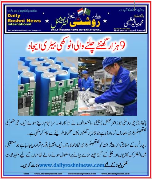 ہالینڈ(ڈیلی روشنی نیوز انٹرنیشنل )چینی سائنسدانوں نے بڑا کارنامہ سرانجام دیتے ہوئے ایک نئی قسم کی لیتھیئم بیٹری متعارف کروا دی ہے جو 9 ہزار گھنٹوں تک محفوظ طریقے سے کام کرسکتی ہے۔