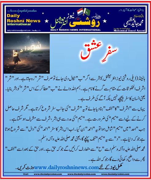 ہالینڈ(ڈیلی روشنی نیوز انٹرنیشنل )بشر سے اگر “ب” نکال دی جائے تو صرف “شر” رہ جاتا ہے۔ اور “شر” اشرف المخلوقات کے مقام سے گِرنے کا نام ہے۔ بسم اللہ والے نے “ب” عطا کر کے اس “شر” کو بشر بنایا۔ یعنی انسان کا سفر پیچھے نہیں بلکہ آگے کی طرف ہے۔