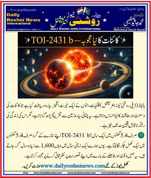 NASA کے TESS مشن اور زمینی دوربینوں کی مدد سے یہ دریافت سیاروں کی تشکیل اور انتہاؤں کو سمجھنے کا نایاب موقع فراہم کرتی ہے۔ TOI-2431 b ہمیں سکھاتا ہے کہ کائنات صرف خوبصورتی نہیں، بلکہ طاقت، شدت اور حیرت کا نام بھی ہے۔