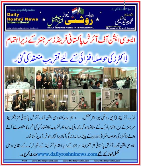 لمرک آئرلینڈ (ڈیلی روشنی نیوز انٹرنیشنل ۔۔۔وسیم بٹ) ایسوسی ایشن آف آئرش پاکستانی فزیشنز اینڈ سرجنز کے زیر اہتمام لمرک کے مقامی ہوٹل میں ایک پروقار تقریب کا انعقاد کیا گیا جس کا مقصد نئے آنے والے ڈاکٹرز کی حوصلہ افزائی اور ان کے پیشہ ورانہ زندگی آغاز پر انہیں خوش آمدید کہنا تھا ۔