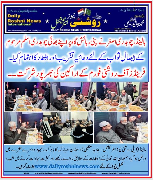 ہالینڈ(ڈیلی روشنی نیوز انٹرنیشنل – جاوید عظیمی) رمضان المبارک کابا برکت مہینہ دوسرےعشرے میں داخل ہو گیا ، مسلمان اللہ تعالیٰ کے احکامات کےمطابق روزے رکھنے اور کثرت عبادات کرنے میں شب و روز مصروف عمل ہیں، جبکہ مسلمان اپنی بساط کے مطابق روزہ کشائی کا سلسلہ بھی جاری رکھے ہوئے ہیں ۔ گزشتہ دنوں بروز اتوار یکم مارچ 2026 فرینڈز آف روشنی فورم کے اہم رکن چوہدری محمد اصغر نے اپنی رہائش گاہ پر اپنے بھائی چوہدری محمد اسلم مرحوم کی روح کو ایصال ثواب نذر کرنے کے لئے دعائیہ تقریب اور روزہ کشائی کا اہتمام کیا۔ اس موقعہ پر ایک پر وقار روحانی تقریب کا اہتمام کیا گیا۔ ، تقریب کے آغاز میں سوره یاسین، استغفار پڑھی گئی، بعد ازاں چوہدری اکرام الحق نے تلاوت قرآن کی سعادت حاصل کی جبکہ میزبان چوہدری اصغر نے محبت بھرے انداز میں نعتیہ اشعار پیش کئے۔ روشنی نیوز کے روح رواں محمد جاوید عظیمی نے ذکر جہر کروایا اور اجتماعی دعا میں تقریب میں پڑھے گئے قرآنی کلمات کو میزبان کے بھائی چوہدری اسلم مرحوم کی روح کو ایصال ثواب نذر کیا۔ تقریب میں موجود جاوید عظمی، میاں عاصم ، میاں عمران، چوہدری الیاس، چوہدری بنارس ،چاند ،ملک چوہدری اقبال، میاں آفتا ب، حاجی محمد نواز، چوہدری اکرام، احتشام اور محمد کامران کی خدمت میں پر تکلف افطار اور مختلف انواع و اقسام کے پاکستانی کھانے پیش کئے گئے ۔ کھانے کے بعد تمام شرکا نے روشنی نیوز کے ایم ڈی میاں عاصم محمود کی امامت میں نماز مغرب ادا کی۔نماز سے فراغت کے بعد میزبان اول چوہدری محمد اصغر نے شرکائے تقریب کی تواضع مختلف اقسام کے تیار کئے گئےمیٹھے اور چائے سے کی۔ بعد ازاں میزبان نے اپنے مخصوص انداز میں شکریہ ادا کرتے ہوئے شرکائے تقریب کو عزت و احترام سے رخصت کیا اس دوران ویڈیو فلم بھی تیار کی گئی۔